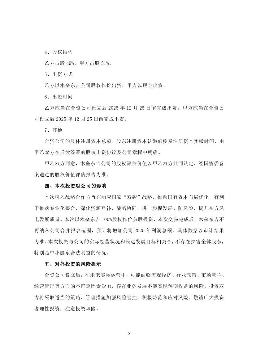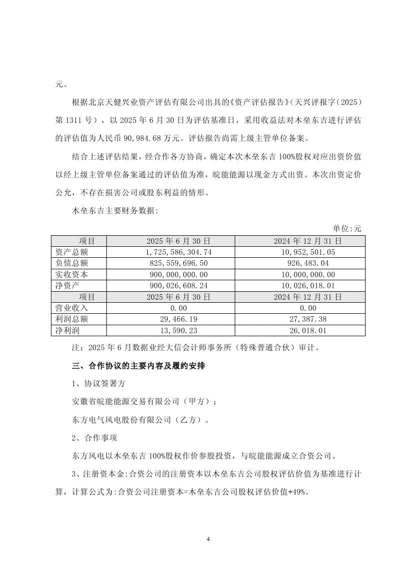 東方電氣控股子公司與皖能能源共同成立合資公司,東方風電持股49%,皖能能源持股51%。合資公司注冊資本為:185,683.0205萬元,東方風電以木壘東吉新能源有限公司100%股權作價出資,根據北京天健興業資產評估有限公司出具的資產評估報告,基于評估基準日2025年6月30日,木壘東吉新能源有限公司評估后的股東全部權益價值為90,984.68萬元,皖能能源以94,698.3405 萬元現金出資。