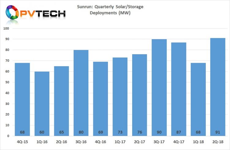雖然季節(jié)性在部署和收入確認方面發(fā)揮了作用,但Sunrun的太陽能屋頂部署已從2016年第二季度的65MW增加到2018年第二季度的91MW。