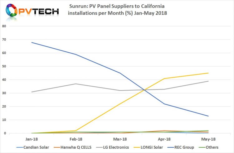 LONGi Solar于2018年初開始作為Sunrun的新供應商,2018年前四個月的平均份額達到25%。