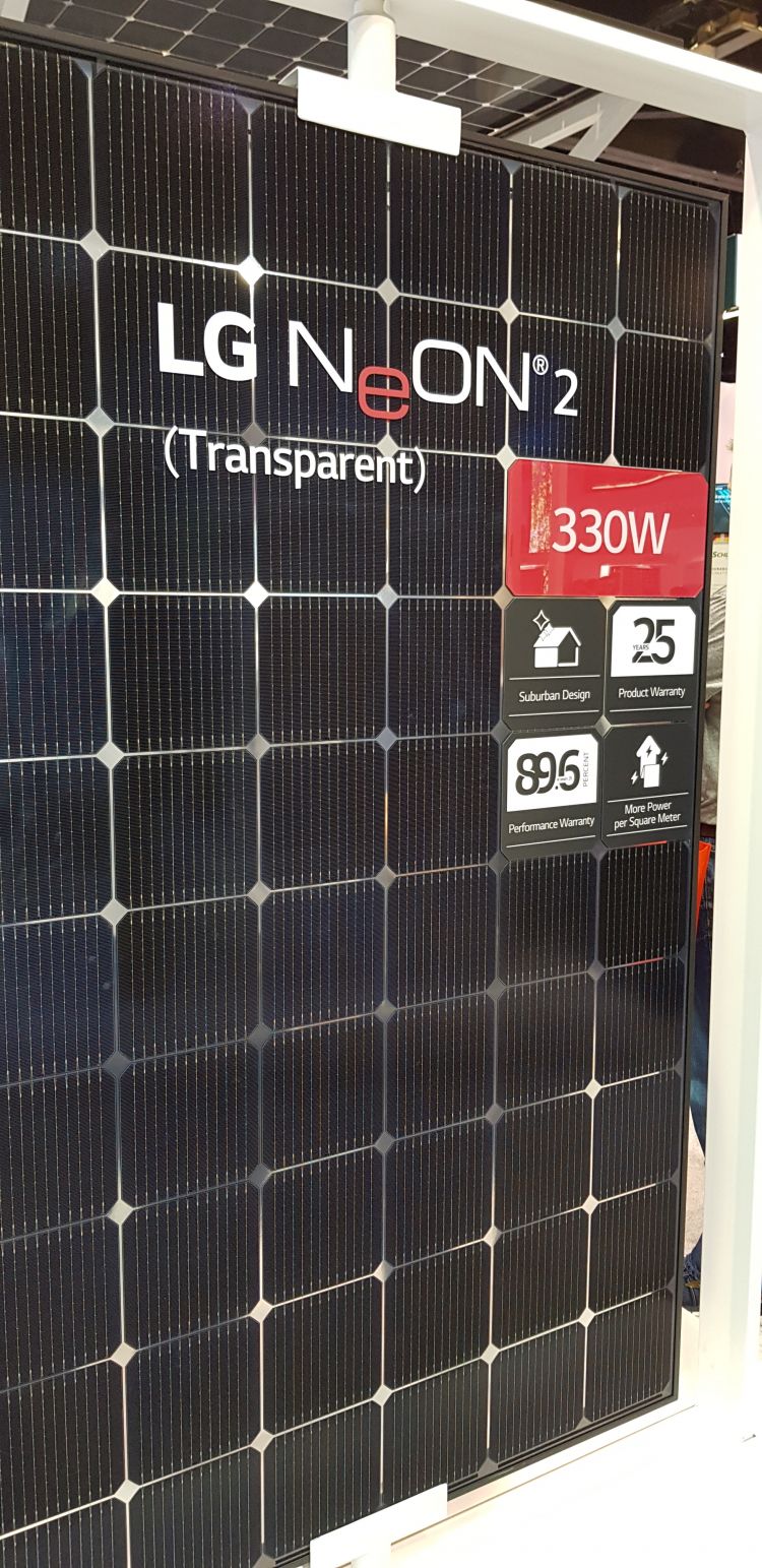 LG電子在SPI 2018上展示了其“NeON 2”系列面板,其中包括透明底片??,通過將屋頂顏色與細胞間距混合,改善了住宅系統(tǒng)的美觀。圖片:PV Tech